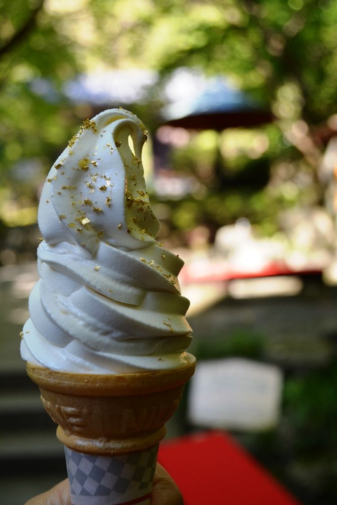 紅葉の下で食べる 金箔ソフトクリームも格別でしょう。