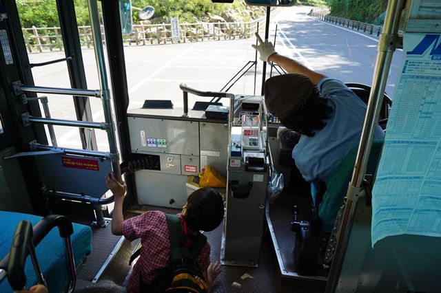 バスは、金山の裏側へも回るため、車窓からの風景に興味津々。