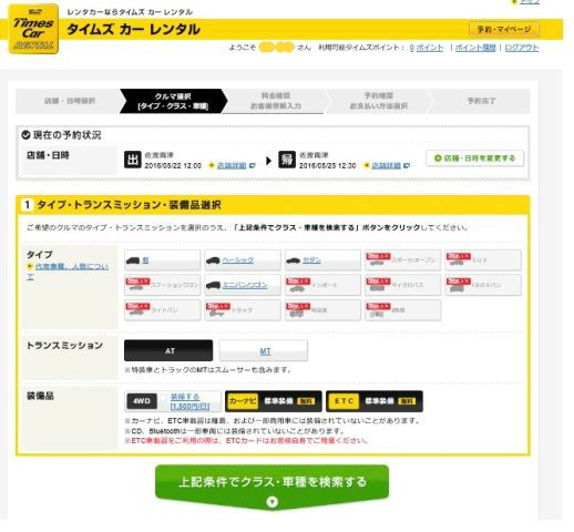 車のタイプ(軽・ベーシック・セダンなど)やトランスミッション(AT/MT)、装備品を選択。