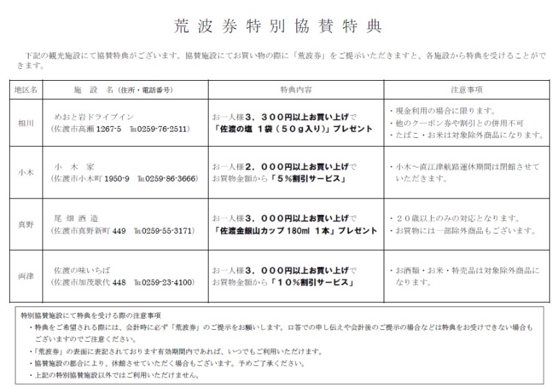 その他、荒波券の提示で特典付!小木家・めおと岩観光・尾畑酒造・佐渡の味いちば