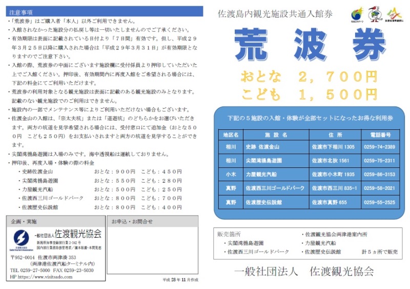 そんな冬の佐渡に来てくださった方に、観光施設をお得に利用できる荒波券が発売されました。