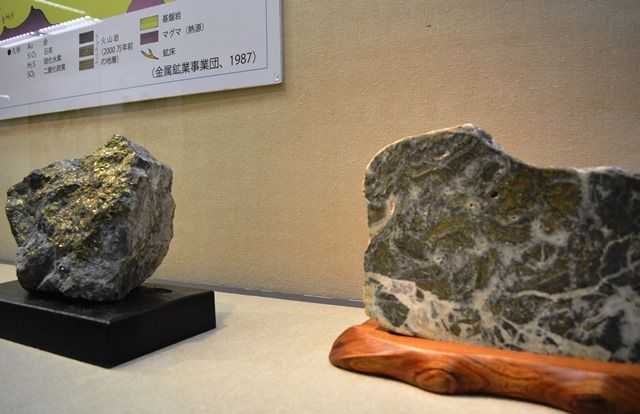 左:表面に見えるキラキラしたものは、黄銅鉱。