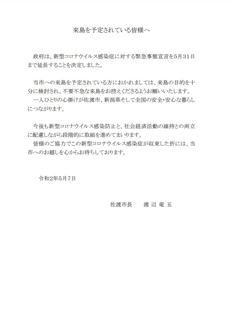 5月7日に佐渡市 渡辺市長より5月31日までの自粛要請延長のお知らせが佐渡市HPにありました。