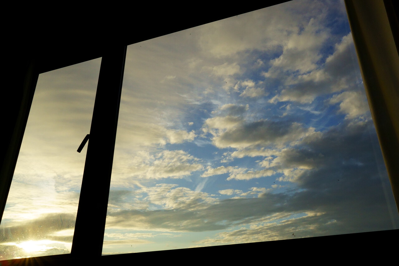 雲の多い朝。部屋のガラス窓ごしに一枚。